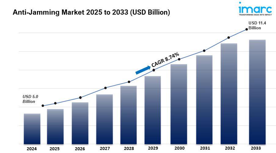 The global anti-jamming market size reached USD 5.0 Billion in 2024. Looking forward, IMARC Group expects the market to reach USD 11.4 Billion by 2033, exhibiting a growth rate (CAGR) of 8.74% during 2025-2033. The increasing reliance on global positioning system (GPS), rising military and defense requirements, growing incidents of malicious threats, widespread infrastructure development, increasing awareness about data privacy, and the emergence of autonomous cars and interconnected vehicles are some of the major factors propelling the market.