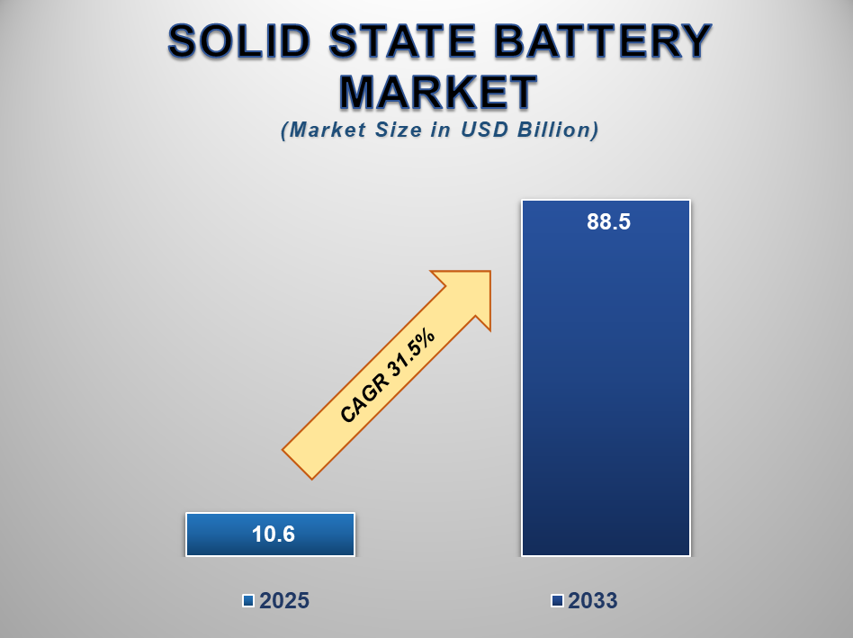 The Global Solid-State Battery Market is set for remarkable expansion between 2025 and 2033, driven by the rising demand for advanced energy storage solutions across multiple industries. The market is projected to be valued at USD 10.6 billion in 2025 and is expected to reach approximately USD 88.5 billion by 2033, reflecting an impressive CAGR of 31.5% during the forecast period.