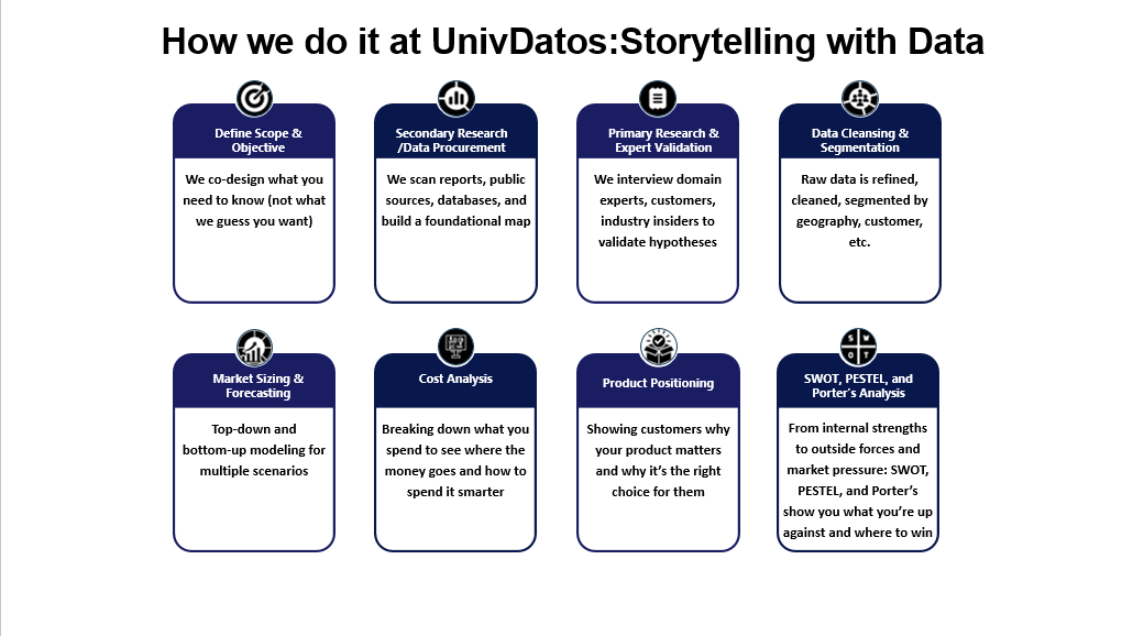 At UnivDatos, we merge findings with a captivating narrative to provide valuable insights. Our work is based on deep research, thoughtful planning, and effective communications, which ensure that each project is based on data rather than just a narrative. What we offer through our research: