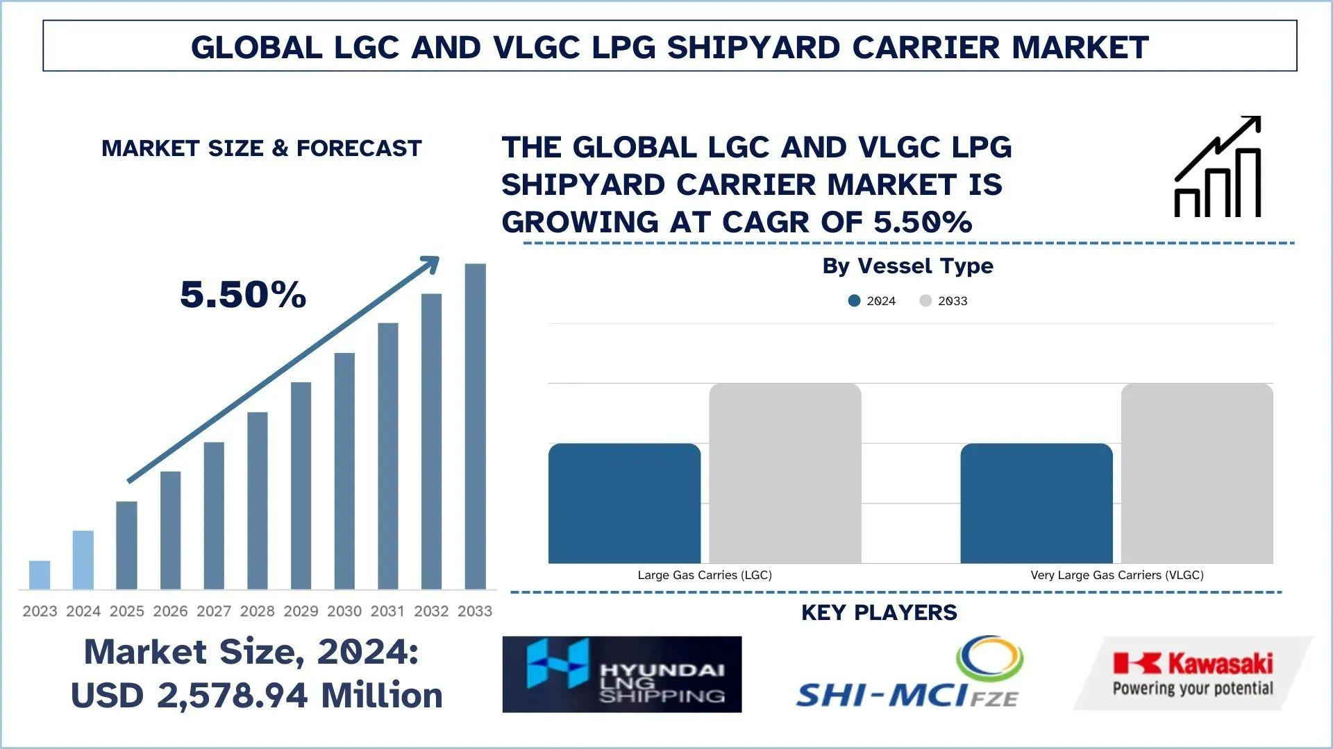 According to UnivDatos analysis, rising global demand for LPG as a clean fuel, coupled with increasing partnerships in sustainable LGC and VLGC LPG shipyard carrier practices, are the major factors driving the growth of the LGC and VLGC LPG shipyard carrier market. As per their “LGC and VLGC LPG Shipyard Carrier Market” report, the global market was valued at USD 2,578.94 million in 2024, growing at a CAGR of about 5.50% during the forecast period from 2025 - 2033 to reach USD million by 2033.