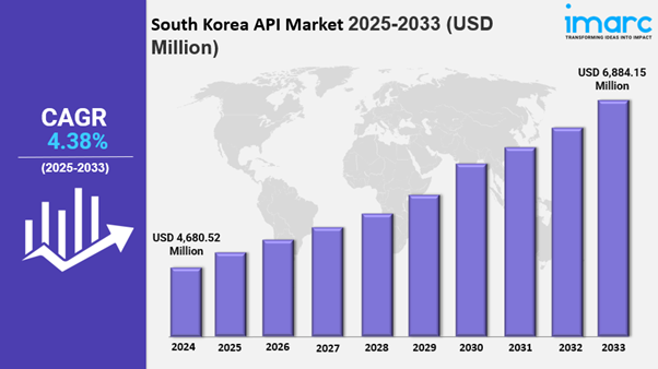 The South Korea api market was valued at USD 4,680.52 Million in 2024. Looking forward, IMARC Group estimates the market to reach USD 6,884.15 Million by 2033, exhibiting a (CAGR) of 4.38% from 2025-2033.