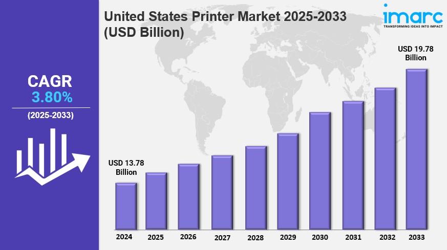 The United States printer market size was valued at USD 13.78 Billion in 2024. Looking forward, IMARC Group estimates the market to reach USD 19.78 Billion by 2033, exhibiting a CAGR of 3.80% from 2025-2033.