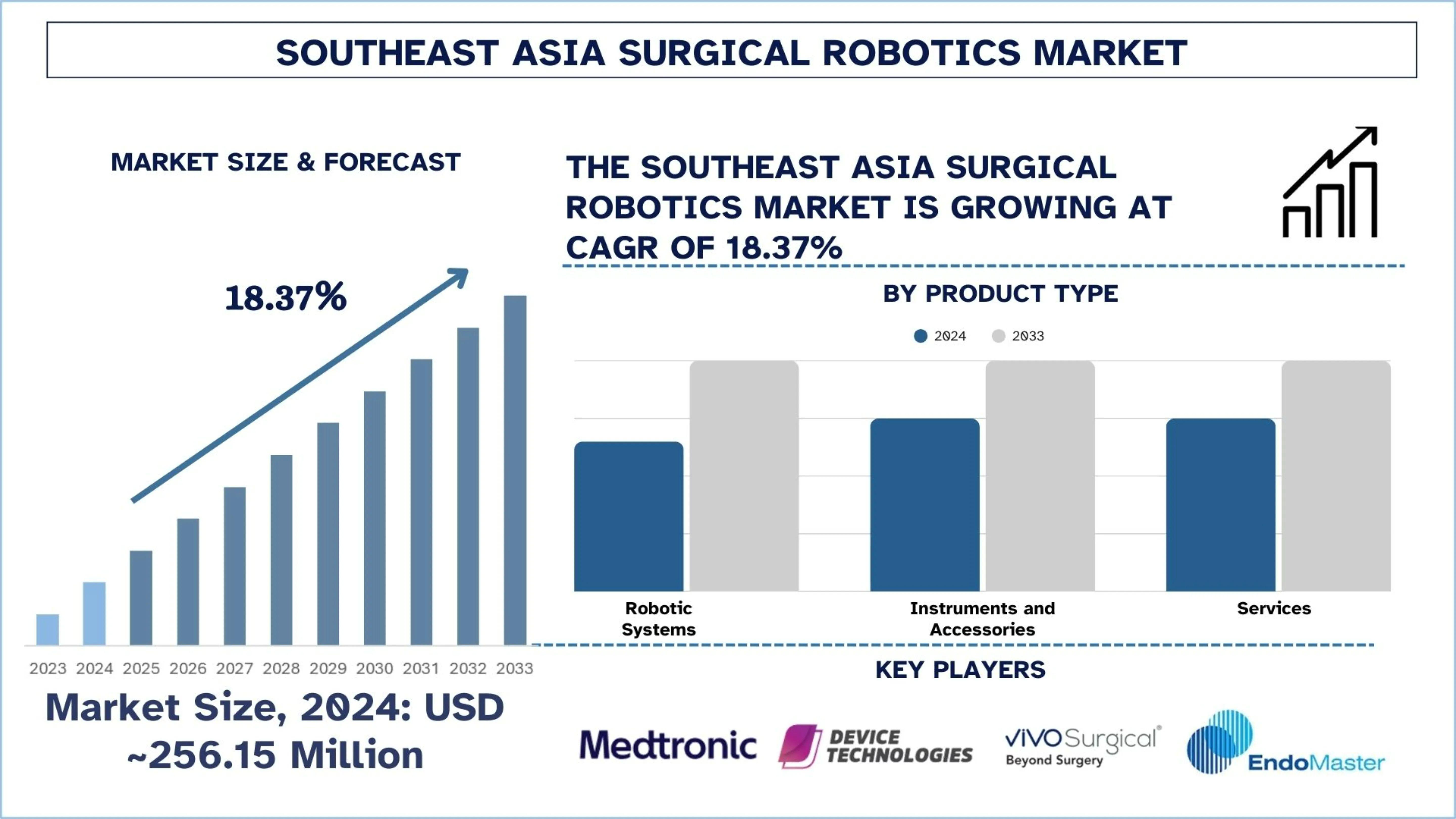 According to a new report by UnivDatos The Southeast Asia Surgical Robotics Market is expected to reach USD million in 2033 by growing at a CAGR of 18.37% during the forecast period (2025- 2033F). Adoption is being driven by increased demand in minimally invasive surgeries, rapid growth of privately owned hospitals, and the development of medical tourism destinations in Thailand and Singapore, among others. The market is further propelled by supportive healthcare investments, rising disposable income, and regulatory support. Moreover, the rising introduction of technological innovations drives the growth of the market.