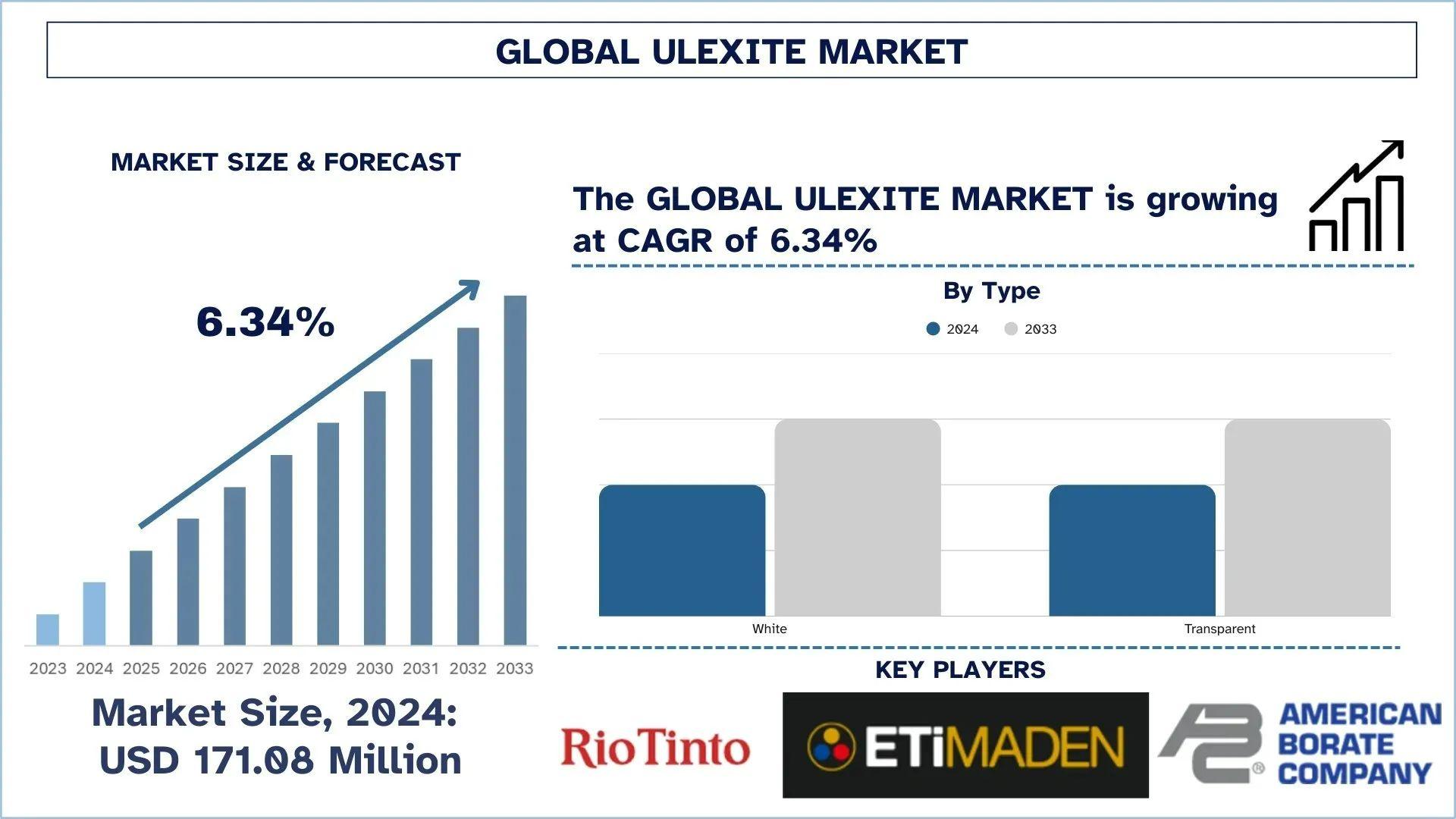According to a new report by UnivDatos the Ulexite Market is expected to reach USD million by 2033, growing at a CAGR of 6.34% during the forecast period (2025-2033F). Ulexite is a major market across the world in the fields of agriculture, glass manufacture, and chemicals. Ulexite, an occurrent boron mineral, is mainly used as a glass-making flux and a fertilizing supply of boron. In farming, it increases the quality of soil and improves crop yield because it contains important nutrients such as boron, which is very fundamental to a plant. With an ever-increasing global population, there is a demand to feed more people, which means an increase in the need for fertilizers produced through ulexite. The rising popularity of ecological and sustainable agriculture is another factor that promotes the increased application of ulexite-based fertilizers. Ulexite is also applied in ceramics, detergents, and the production of boron-related chemical industries. With the increased application of ulexite in industrial activities, the global ulexite market is set to boom due to the embracement of sustainable farming processes.