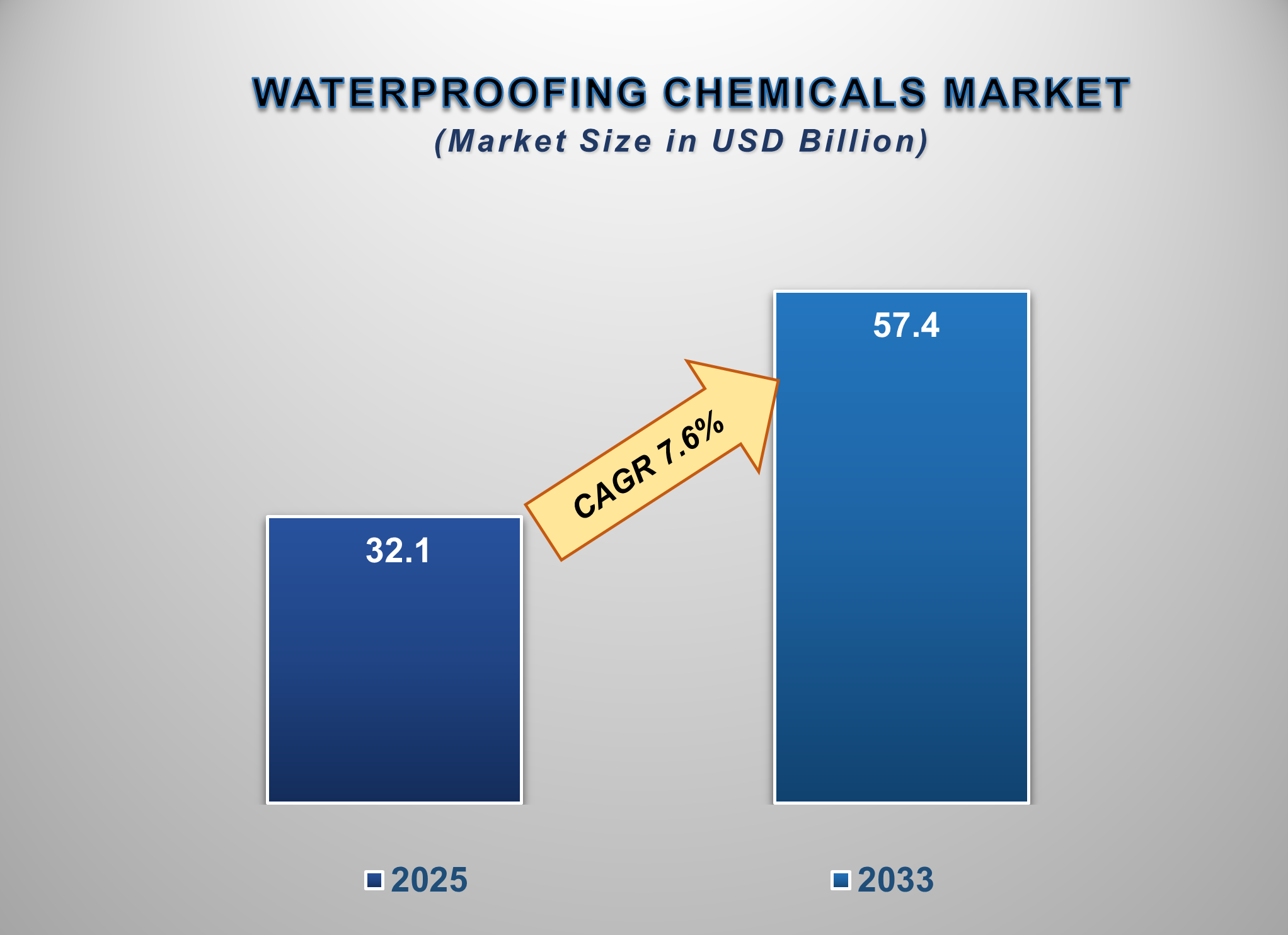 The waterproofing chemicals market size is projected to witness substantial growth from 2025 to 2033, propelled by rapid global urbanization, increasing investments in infrastructure development, and a growing emphasis on the longevity and durability of structures. Valued at approximately USD 32.5 billion in 2025, the market is expected to surge to USD 55.8 billion by 2033, reflecting a steady compound annual growth rate (CAGR) of 7.0% over the forecast period.