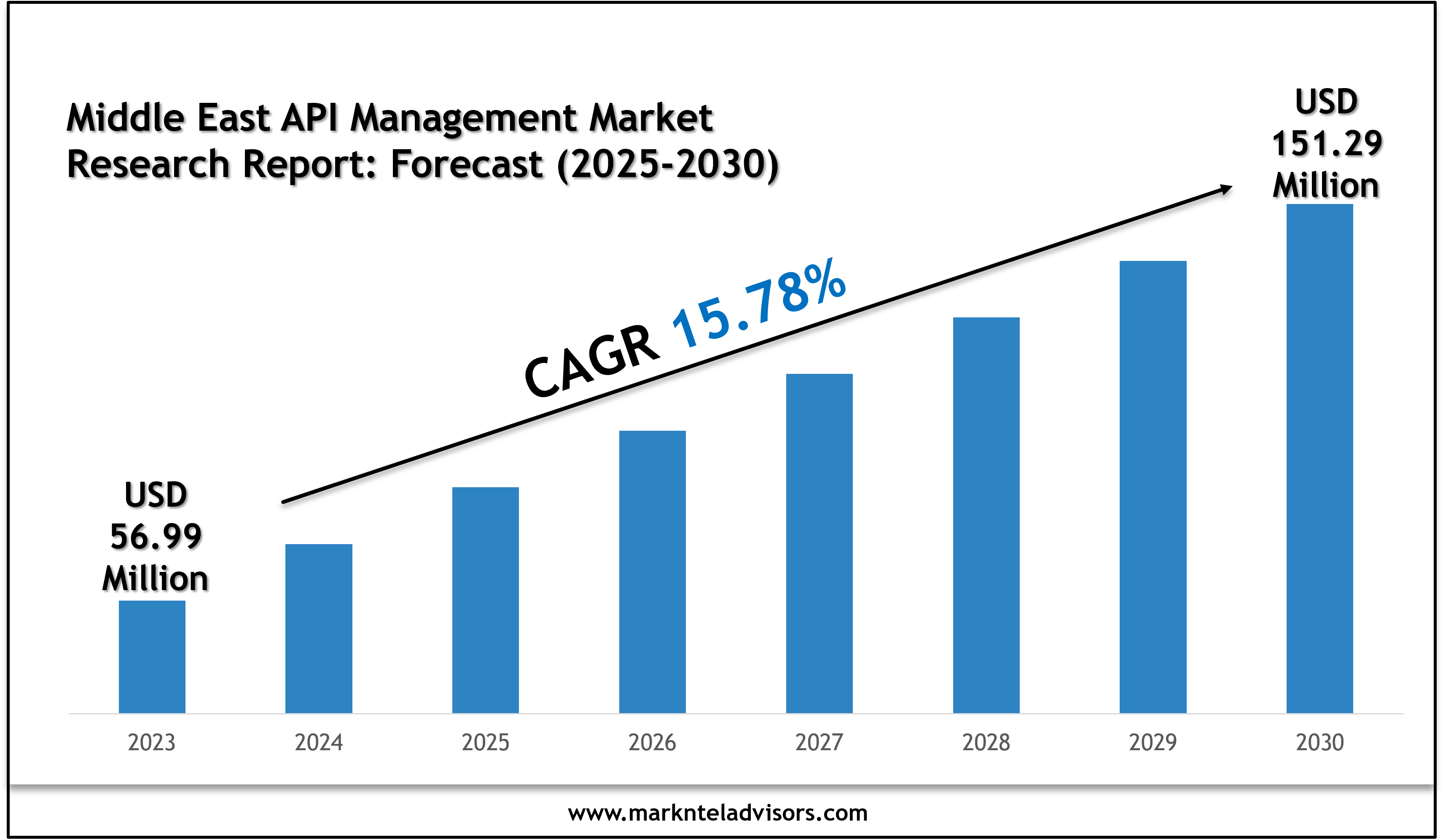 As per MarkNtel The Middle East API Management Market size was valued at around USD 56.99 Million in 2024 and is projected to reach USD 151.29 Million by 2030. Along with this, the market is estimated to grow at a CAGR of around 15.78% during the forecast period, i.e., 2025-30.