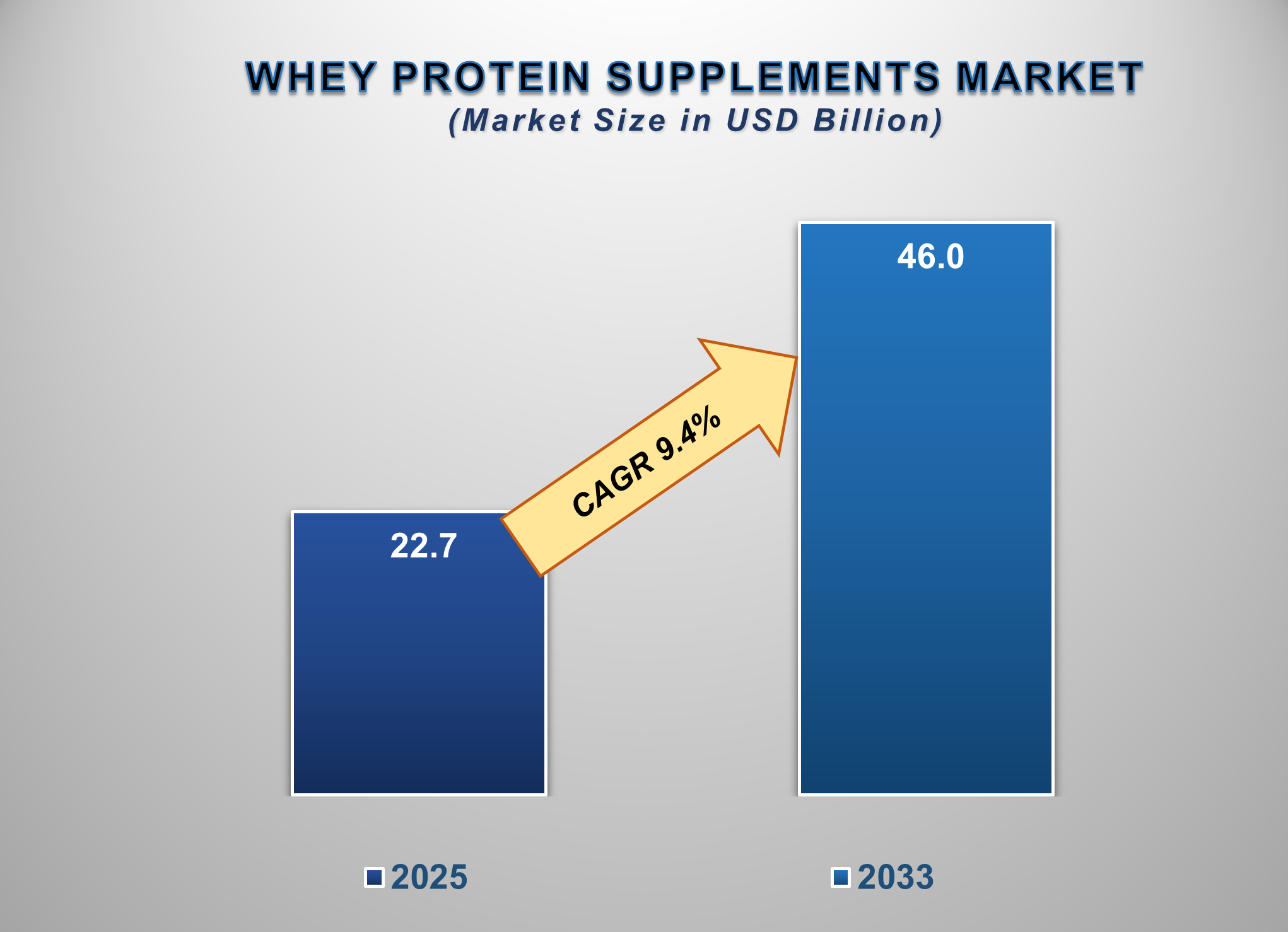 The global Whey Protein Supplements Market is a vibrant, rapidly expanding segment of the health and wellness industry, driven by increasing consumer focus on fitness, Valued at USD 22.7 billion in 2025, the market is projected to reach USD 46.0 billion by 2033, growing at a robust CAGR of 9.4% during the forecast period.
