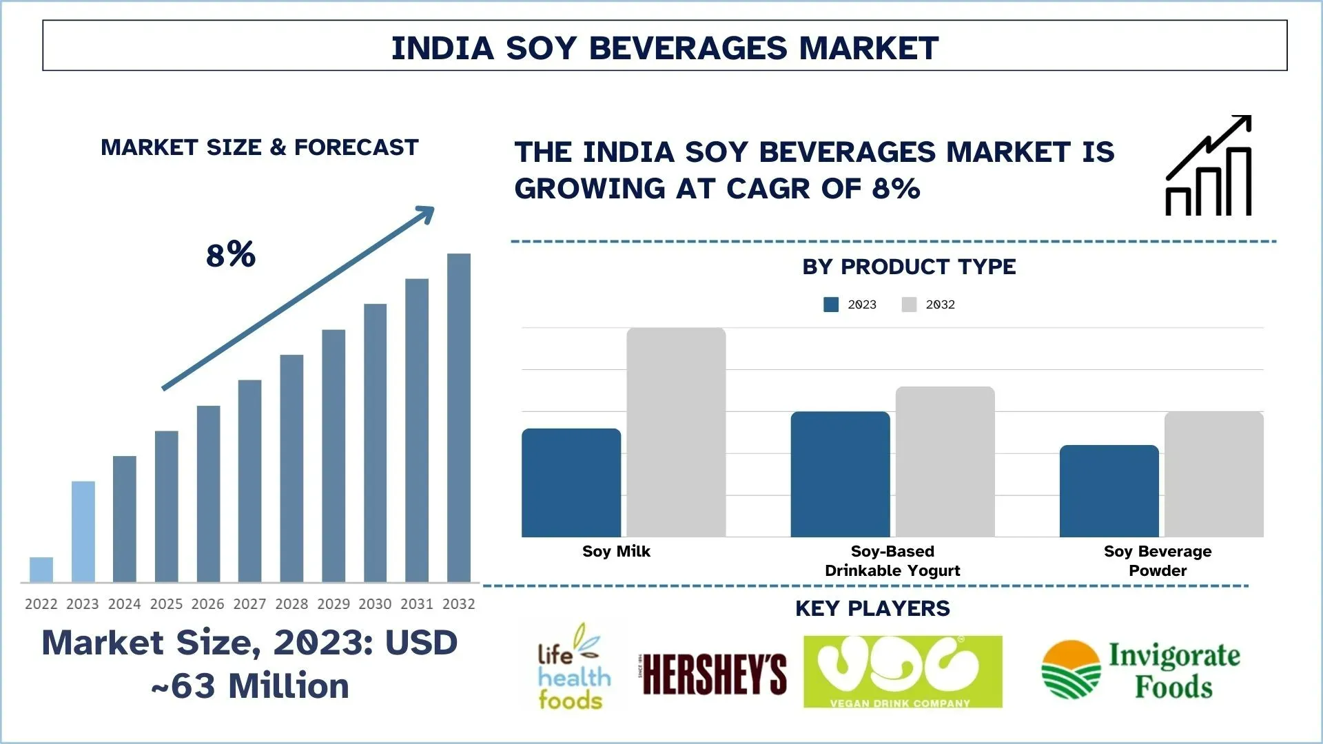 According to UnivDatos the India Soy Beverages Market was valued at approximately USD 63 million in 2023 and is projected to grow at a CAGR of 8% from 2024 to 2032.