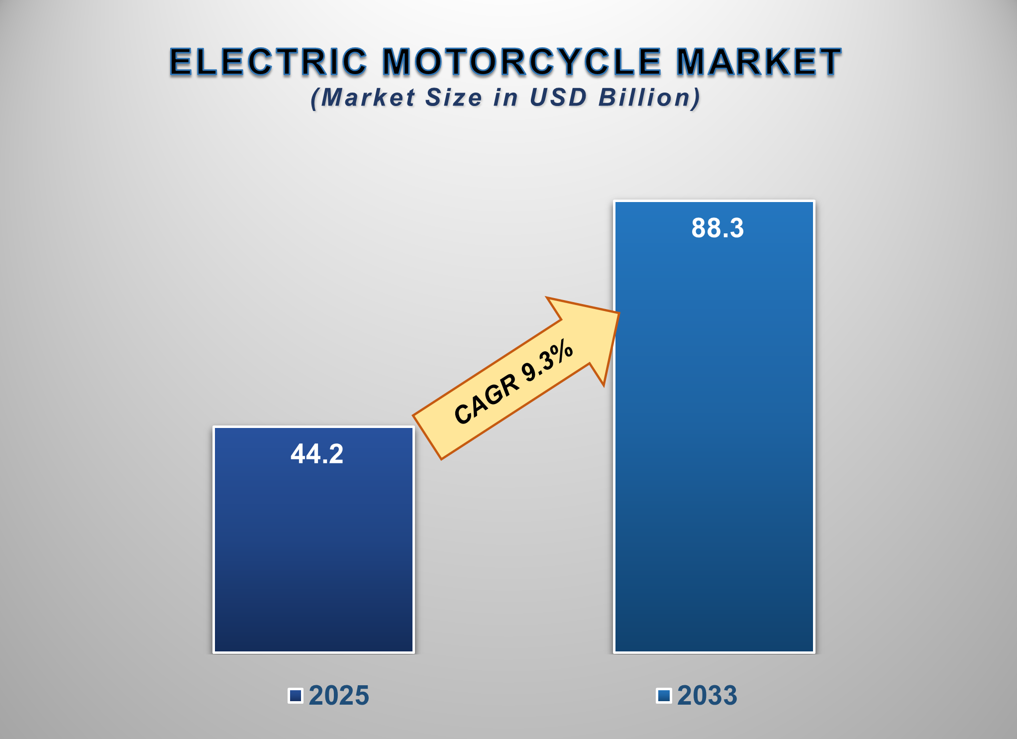 The Electric Motorcycle Market is accelerating into a period of transformative growth from 2025 to 2033, driven by global sustainability initiatives, advancements in battery technology, rising fuel costs, and growing consumer acceptance of electric mobility. The market is projected to be valued at approximately USD 44.2 billion in 2025 and is forecasted to reach nearly USD 88.3 billion by 2033, exhibiting a compound annual growth rate (CAGR) of 9.3% during this period.