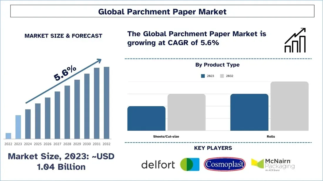 The global Parchment Paper Market was valued at USD 1.04 Billion in 2023 and is expected to grow to a strong CAGR of around 5.6% during the forecast period (2024-2032)