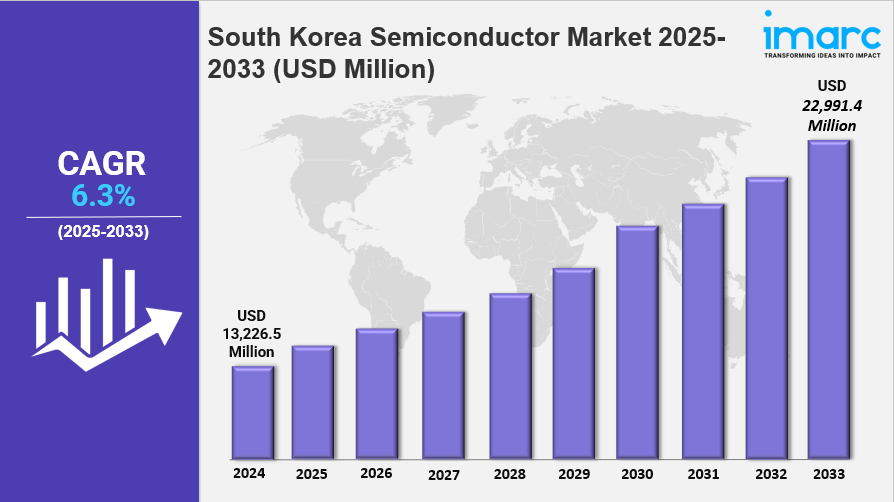 The South Korea Semiconductor Market size was valued at USD 13,226.5 million in 2024. It is expected to reach USD 22,991.4 million by 2033, growing at a CAGR of 6.3% during the forecast period of 2025–2033. The market growth is driven by the rising demand for electronics and connectivity in both consumer and industrial sectors along with the increasing adoption of wearable devices across the country.