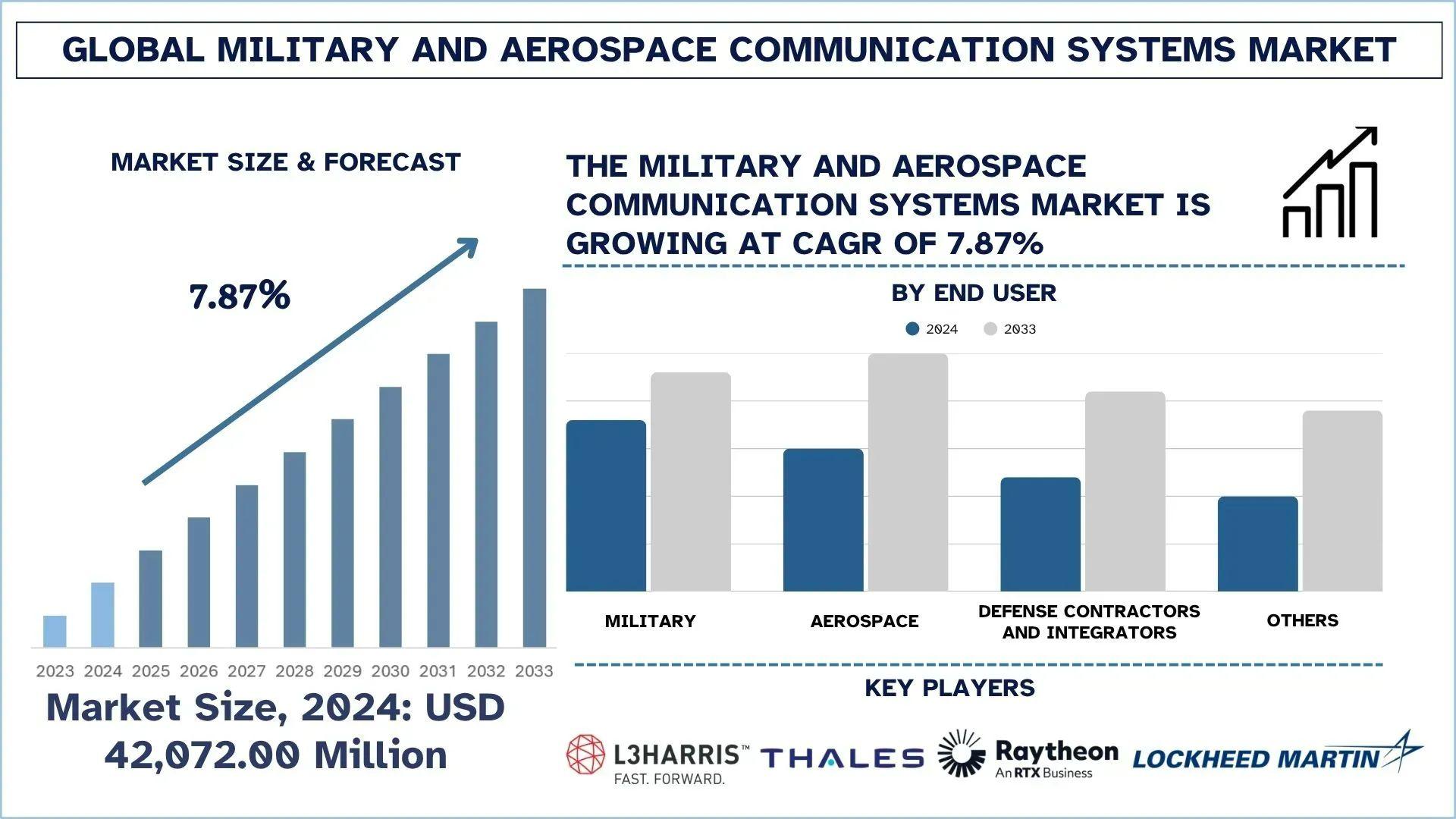 According to a new report by UnivDatos, the Military and Aerospace Communication Systems Market is expected to reach USD million in 2033 by growing at a CAGR of 7.87%. The market is driven by the growing defense modernization efforts, the growing usage of network-centric warfare strategic plans, and the expanding demand for secure, encrypted information transmission in complicated battlefields. The growth of satellite communication infrastructure, the proliferation of unmanned aerial systems and autonomous systems, and the constant development of high-bandwidth fiber and optical communication networks are also driving market demand.