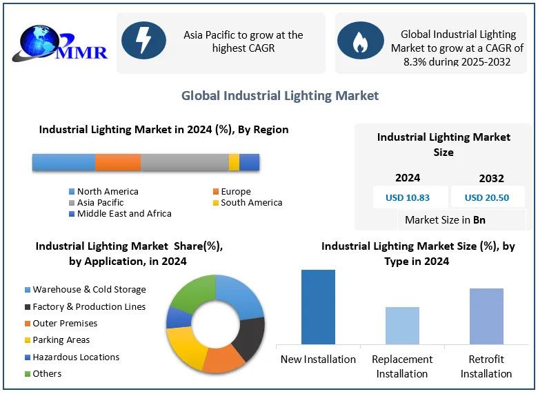 The global Industrial Lighting Market has emerged as a critical enabler of safe, productive, and energy-efficient industrial operations. Valued at USD 10.83 billion in 2024, the market is projected to grow at a CAGR of 8.3% between 2025 and 2032, reaching nearly USD 20.50 billion by 2032. This growth reflects rising industrial activity, modernization of manufacturing facilities, and increasing adoption of advanced lighting technologies across factories, warehouses, oil & gas plants, and hazardous locations.