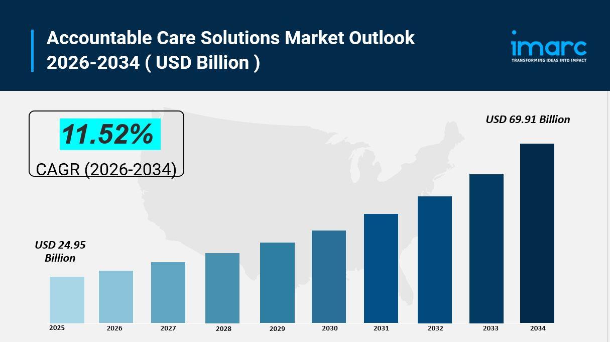 The global Accountable Care Solutions Market was valued at USD 24.95 Billion in 2025 and is forecast to reach USD 69.91 Billion by 2034, growing at a CAGR of 11.52% during 2026-2034. This growth is driven by rising healthcare expenditures, government policies promoting value-based care, increasing adoption of digital health technologies, and the need for improved care coordination and population health management.