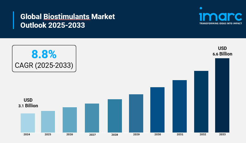 The global biostimulants market was valued at USD 3.1 Billion in 2024 and is projected to reach USD 6.6 Billion by 2033, exhibiting a CAGR of 8.8% during 2025-2033. Growing consumer demand for organic and clean-label food products, governmental efforts to promote sustainable agricultural practices, and advancements in biostimulant technology are driving market expansion. Europe holds a significant share, leading the market with over 38.0% in 2024. The market growth is fueled by the need for increased crop productivity alongside environmental sustainability. The study provides a detailed analysis of the industry, including the biostimulants market report, trends, growth, size, and industry growth forecast.