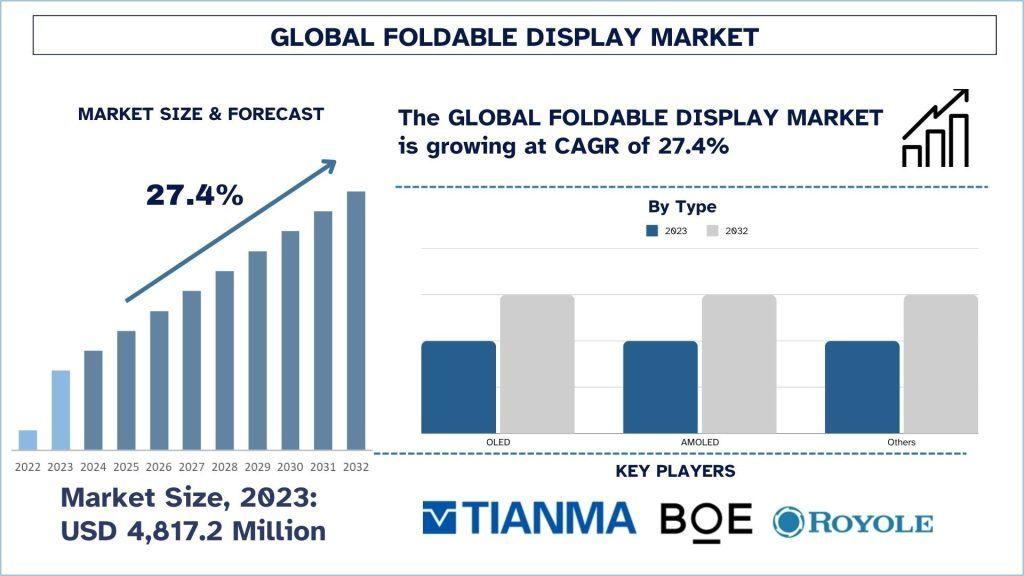 According to a new report by UnivDatos, the Foldable Display Market is expected to reach in 2032 by growing at a CAGR of 27.4%. The foldable display market has grown more recently thanks to major developments in foldable display technologies such as OLED and AMOLED. A foldable display is a screen innovation in technology that enables mobile phones, tablets, and laptops to fold in a way whereby customers get a large screen size within a small portable device. The major drivers of the market are the rising demand for new devices, the need for bigger displays on mobile devices, and the need for better experiences. Further, the adoption of 5G technology has also benefited the market over time, as the foldable device has the potential to enhance the efficiency of 5G’s high-speed feature.