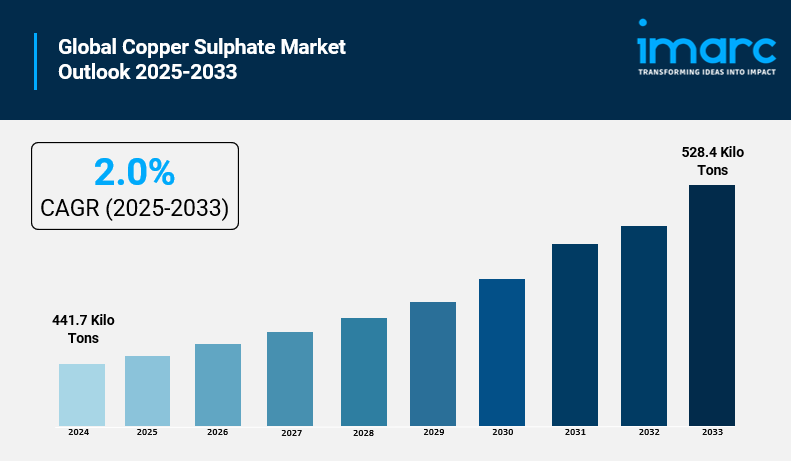 The global copper sulphate market size reached 441.7 Kilo Tons in 2024 and is projected to reach 528.4 Kilo Tons by 2033, growing at a CAGR of 2.0% during the forecast period of 2025-2033. This growth is attributed to increasing consumption in the agriculture sector as fungicides, increasing demand in the pharmaceutical industry, increasing use as a catalyst and electrolyte in various applications and processes, and increasing application in mining and metallurgy. Global expansion of application of products in agriculture, water treatment, electroplating, and chemicals manufacturing is driving the market. The study provides a detailed analysis of the industry, including the Copper Sulphate market share, trends, growth, size, and industry growth forecast.