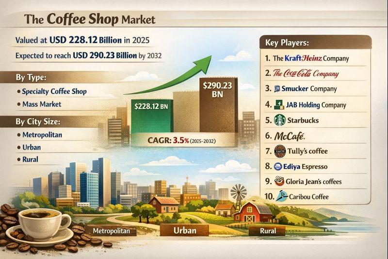 The global Coffee Shop Market is poised for substantial growth, driven by the increasing demand for high-quality coffee and beverages, particularly in urban areas. The market size was valued at USD 228.12 billion in 2025 and is projected to grow at a steady CAGR of 3.5% from 2025 to 2032, reaching approximately USD 290.23 billion by 2032. This growth is fueled by shifting consumer preferences towards specialty coffee, rapid urbanization, and the growing influence of social media and digital platforms in shaping modern coffee culture.