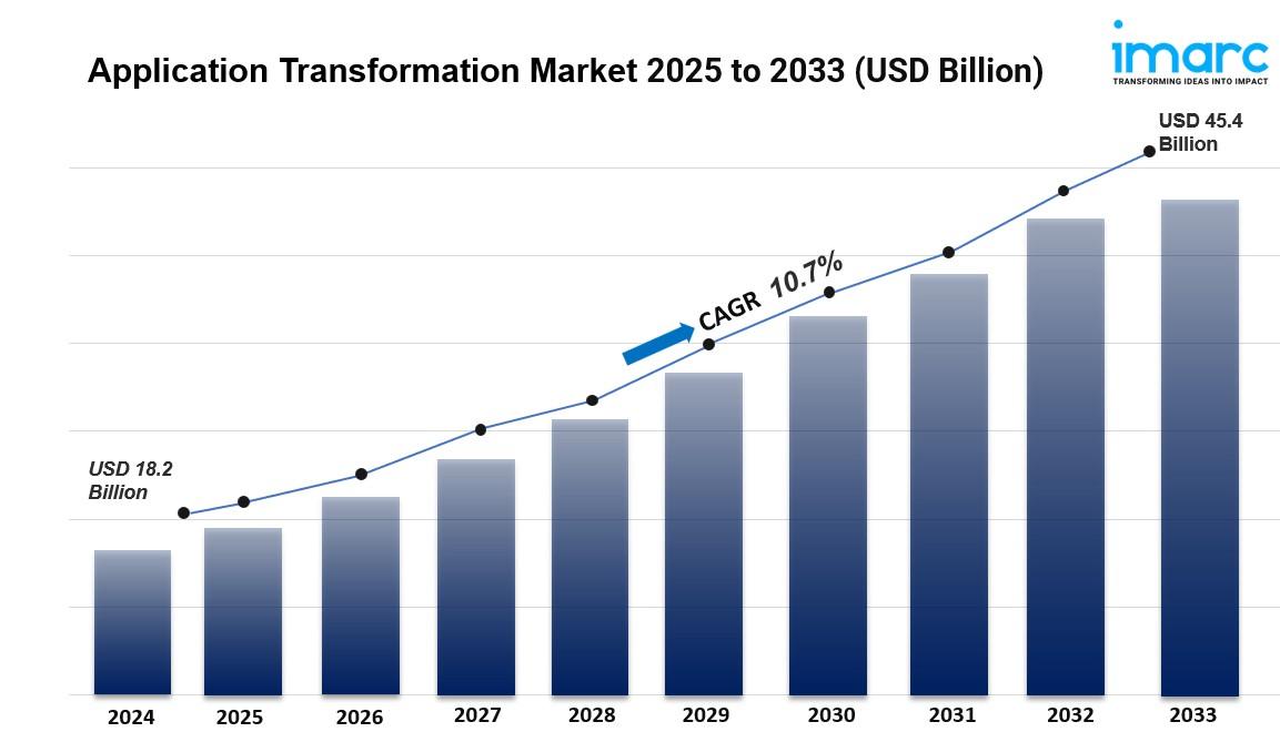 The global Application Transformation Market was valued at USD 18.2 Billion in 2024 and is projected to reach USD 45.4 Billion by 2033. The market is expected to grow at a CAGR of 10.7% during the forecast period 2025-2033. North America leads the market with a share exceeding 36.7% in 2024, driven by advanced IT infrastructure, high cloud adoption rates, rising cybersecurity threats, and investments in AI-driven automation for application modernization.
