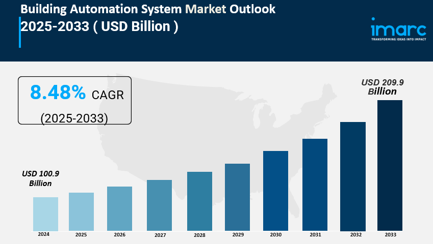 The global Building Automation System Market was valued at USD 100.9 Billion in 2024 and is projected to reach USD 209.9 Billion by 2033, growing at a CAGR of 8.48% during the forecast period of 2025-2033. The market expansion is driven by heightened security concerns, demand for energy-efficient buildings, and integration of advanced technologies such as IoT and AI for real-time monitoring and predictive maintenance.