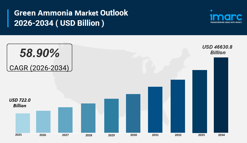 The global Green Ammonia Market was valued at USD 722.0 Million in 2025. It is projected to expand significantly, reaching USD 46,630.8 Million by 2034, growing at a compound annual growth rate (CAGR) of 58.90% during the forecast period 2026-2034. The market is driven by rising demand for sustainable energy, technological advancements in electrolysis, and increasing applications in transportation, power generation, and agriculture.