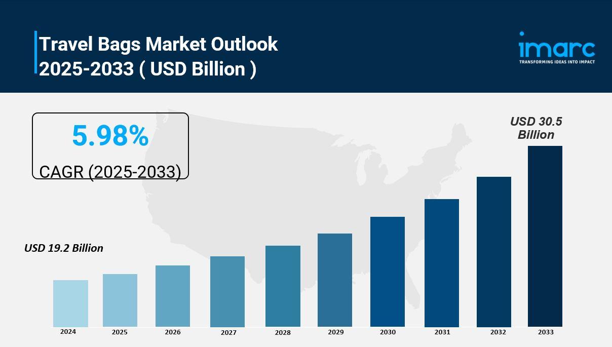 The global Travel Bags Market was valued at USD 19.2 Billion in 2024 and is forecast to reach USD 30.5 Billion by 2033, growing at a CAGR of 5.98% during 2025-2033. This growth is driven by increasing popularity of travel and tourism, rapid advancements in product design and materials, surge in online retailing, rising influence of social media and celebrity endorsements, and growing consumer preference for sustainable and eco-friendly products.