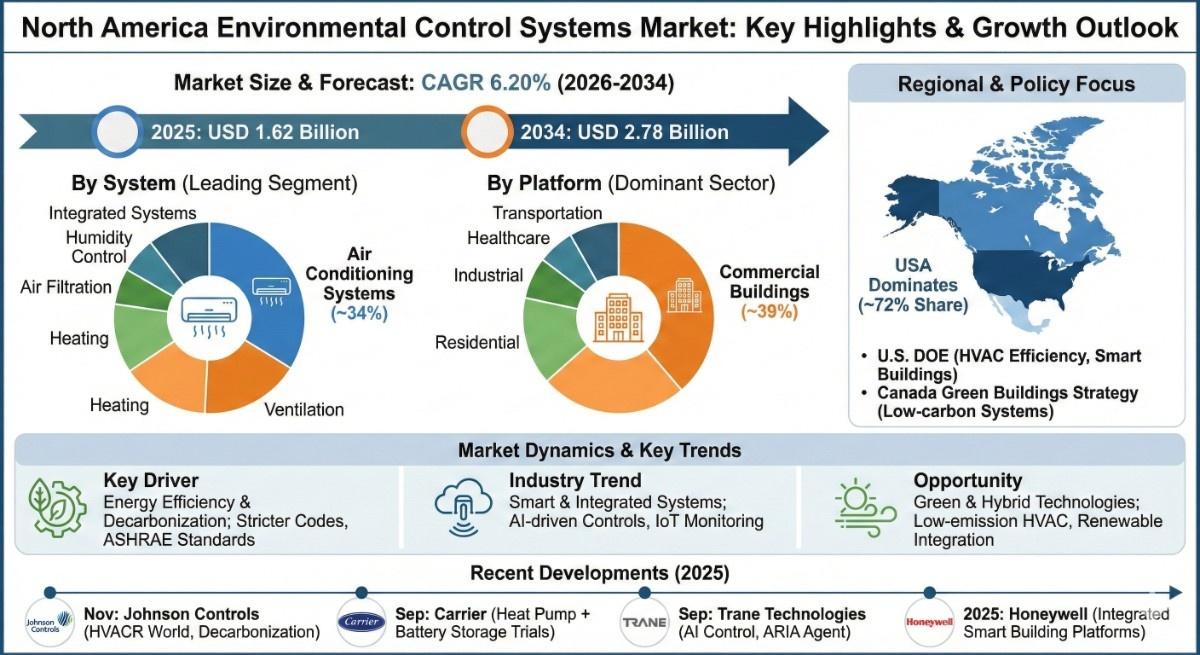 According to the latest report by The Report Cube, study North America Environmental Control Systems Market is anticipated to register a CAGR of 6.20% during 2026-2034. The market size was valued at USD 1.62 billion in 2025 and is projected to reach USD 2.78 billion by 2034. Environmental control systems play a central role in maintaining indoor air quality, thermal comfort, and energy efficiency across residential, commercial, and industrial environments.
