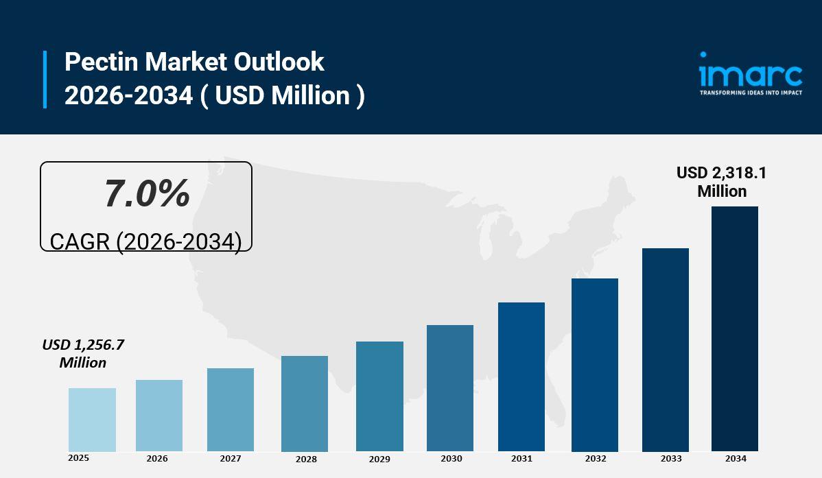 The global pectin market was valued at USD 1,256.7 Million in 2025 and is projected to reach USD 2,318.1 Million by 2034, exhibiting a CAGR of 7.0% during the 2026-2034 forecast period. Growing consumer interest in natural and clean-label food ingredients, expanding demand for plant-based products, and heightened awareness about health and wellness are driving this growth. The pectin market share is expanding rapidly due to increasing application across the thriving food and beverage industry and growing consumer preference for natural gelling agents, thickeners, and stabilizers. Pectin, a naturally occurring polysaccharide extracted from fruits, particularly citrus and apples, is widely recognized for its excellent gelling properties, stabilizing capabilities, and versatility in food applications. Rising demand for ready-to-eat (RTE) and packaged food products, along with growing consumer concerns about synthetic additives, are fueling global demand. Manufacturers are introducing specialized pectin formulations, organic variants, and functional pectin types to attract a wider audience. Additionally, the expansion of pharmaceutical and personal care applications and the growing popularity of vegan and vegetarian diets worldwide are expected to further boost the global pectin market size over the forecast period.