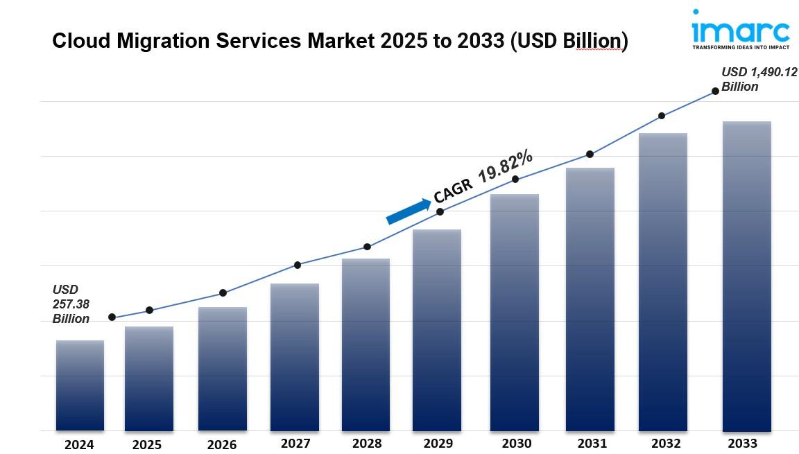 The global Cloud Migration Services Market was valued at USD 257.38 Billion in 2024. It is projected to reach USD 1,490.12 Billion by 2033, growing at a CAGR of 19.82% during 2025-2033. The market growth is propelled by rising multi-cloud adoption, demands for business agility and scalability, enhanced security and compliance needs, cost optimization, and rapid digital transformation fostering advanced IT infrastructure deployment. The Cloud Migration Services Market Size is expanding rapidly as organizations accelerate digital transformation and shift infrastructure to the cloud for greater scalability, flexibility, and cost efficiency.