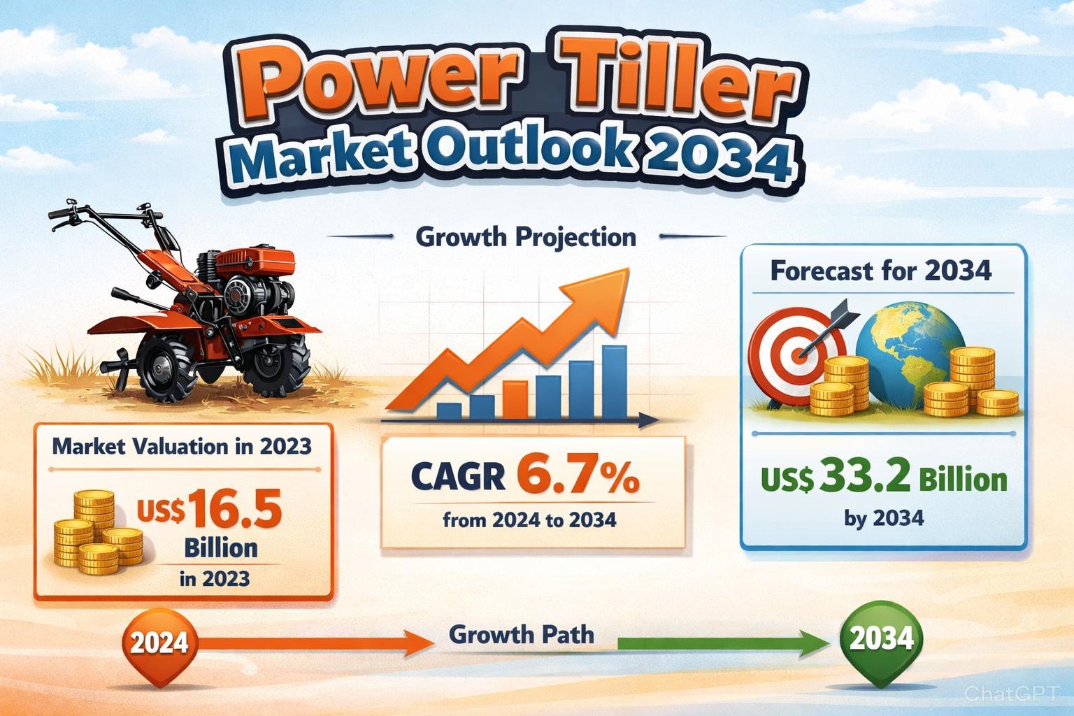 The global power tiller market is entering a dynamic phase of expansion, supported by structural changes in agriculture, rural labor economics, and technological innovation. Valued at US$ 16.5 Bn in 2023, the market is forecast to reach US$ 33.2 Bn by 2034, progressing at a compound annual growth rate (CAGR) of 6.7% during the forecast period. This growth reflects the increasing importance of compact, versatile agricultural machinery designed to meet the needs of small and medium-scale farmers.