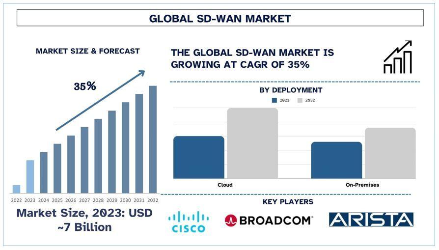 The SD-WAN Market was valued at approximately USD 7 billion in 2023 and is expected to grow at a substantial CAGR of around 35% during the forecast period 2024-2032
