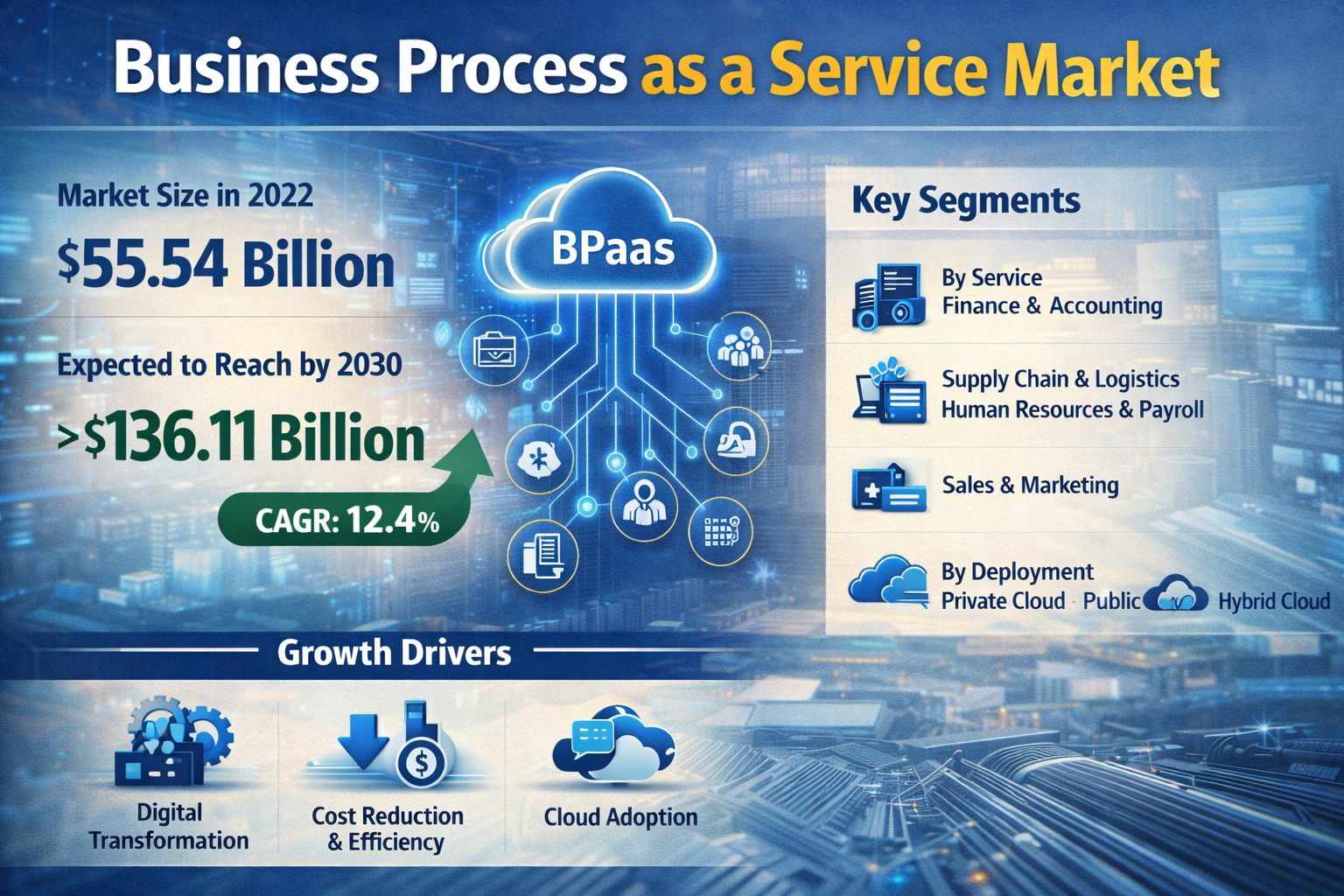 The Business Process as a Service (BPaaS) market is rapidly evolving, driven by the increasing demand for cloud-based solutions that enhance operational efficiency and reduce costs. BPaaS refers to the delivery of business process outsourcing services through cloud computing, enabling organizations to streamline their operations and focus on their core competencies. This article explores the current trends, key drivers, challenges, and future outlook of the BPaaS market.