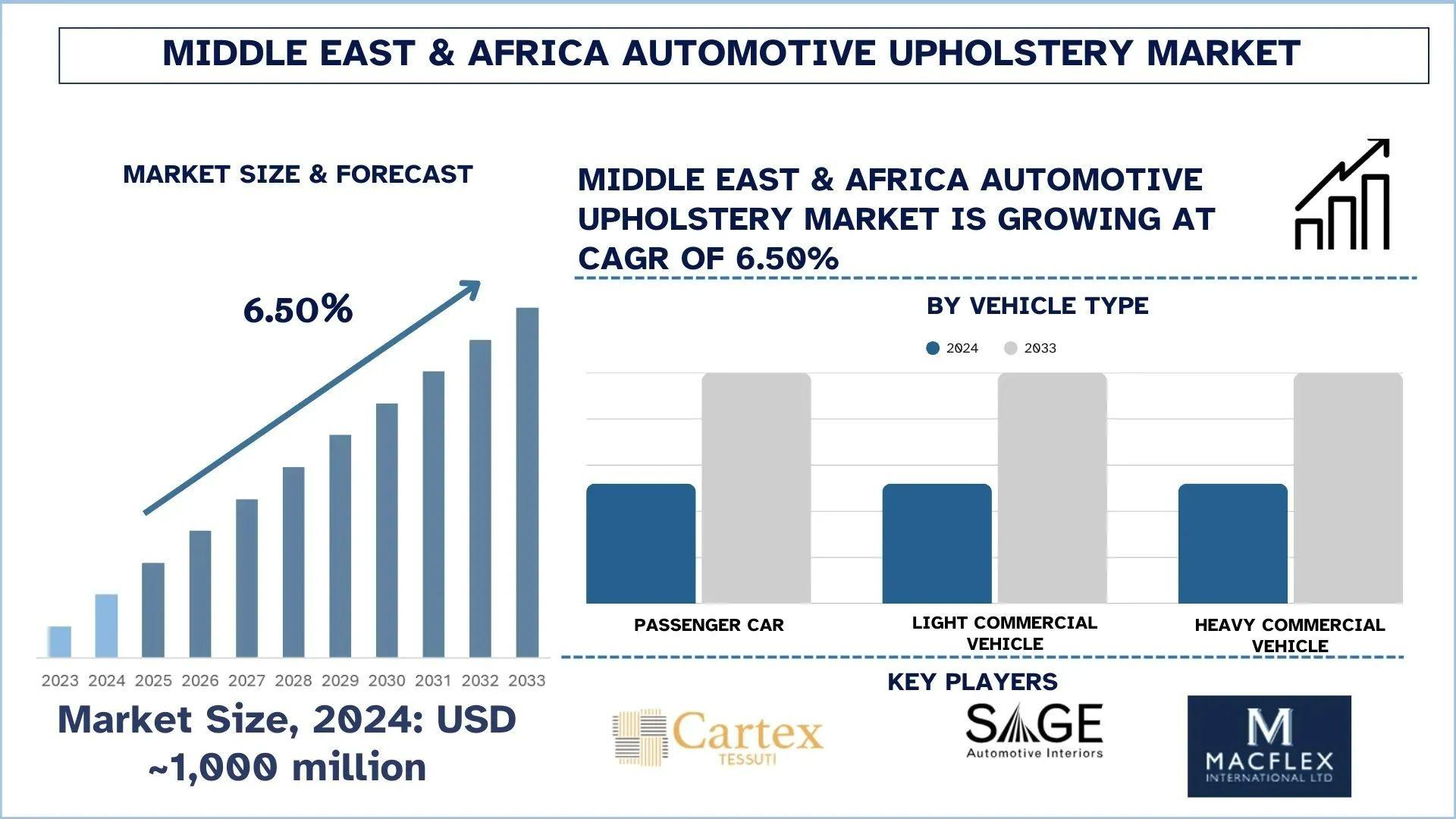 The Middle East & Africa Automotive Upholstery Market is expected to reach a market size of USD 1,000 million by 2024, with a CAGR of 6.50% from 2025 to 2033. Growing Sales of SUVs and Premium Vehicles, and Regional OEM/assembly expansion and localization push are some of the factors that have promoted the market rise. OEMs and tier suppliers are now putting more emphasis on material engineering, including coating, breathability, and low VOC performance, and proven durability testing, and the demands on suppliers to be able to record performance under local conditions.