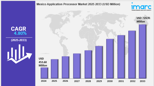 The Mexico application processor market size reached USD 453.60 Million in 2024. Looking forward, IMARC Group expects the market to reach USD 724.91 Million by 2033, exhibiting a growth rate (CAGR) of 4.80% during 2025-2033. The market is driven by rising demand for 5G-enabled smartphones, fueled by expanding telecom infrastructure. Growth in IoT and smart devices further enhances the need for high-performance processors. Additionally, local semiconductor manufacturing is expanding due to nearshoring trends and government support, reducing import reliance. Strategic partnerships with global chipmakers are enhancing domestic production, expanding the Mexico application processor market share.