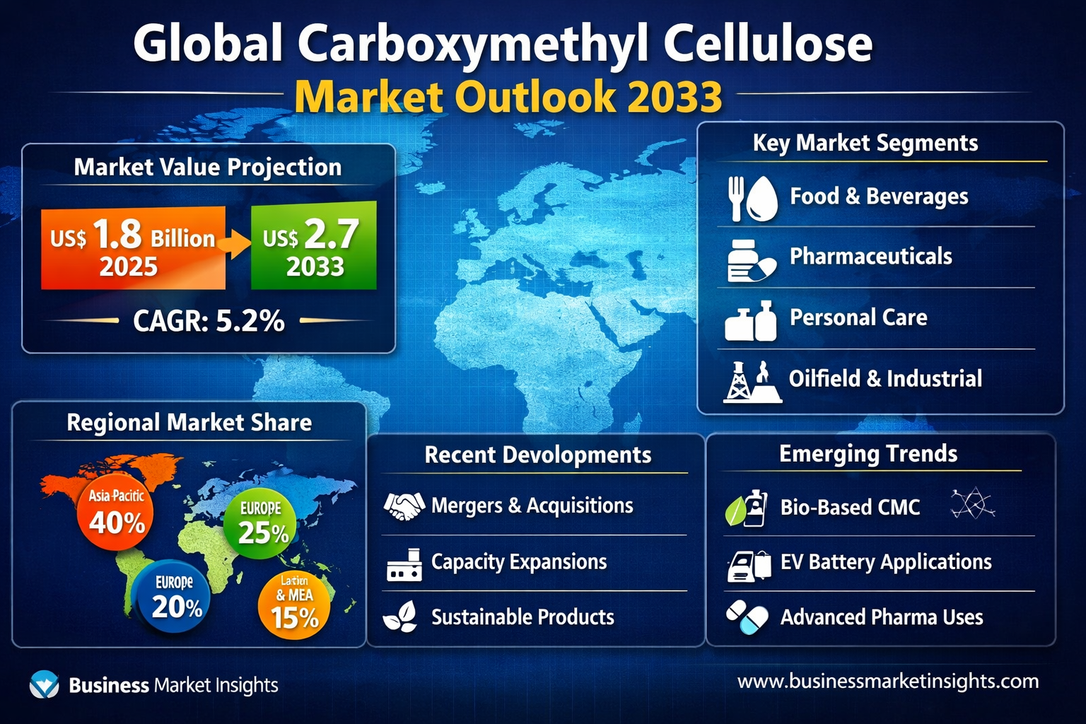 According to the market research report, the global carboxymethyl cellulose market was valued at US$1.8 billion in 2025 and is projected to reach US$2.7 billion by 2033, registering a CAGR of 5.2% during the forecast period from 2026 to 2033. The market is driven by the growing demand for functional additives in processed foods, pharmaceutical formulations, and industrial manufacturing processes. Increasing production capacities and expanding end-use industries are also contributing to the steady growth of the market.
