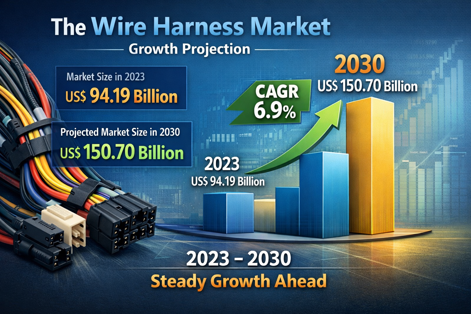 The wire harness market size is projected to reach US$ 150.70 billion by 2030 from US$ 94.19 billion in 2023. It is expected to register a CAGR of 6.9% during 2023–2030. With the rapid development of automotive technologies and the expansion of industrial automation, the demand for wire harness systems continues to rise worldwide.