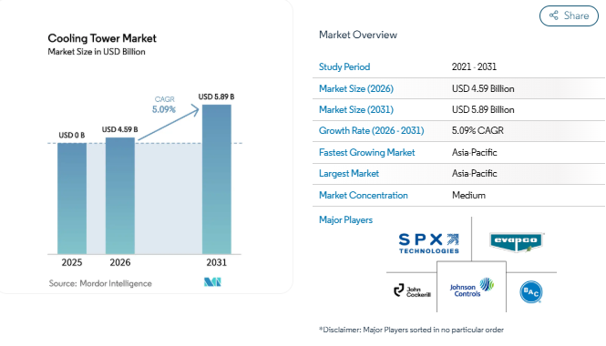 The Cooling Tower Market Size is estimated at USD 4.59 billion in 2026, increasing from USD 4.37 billion in 2025 and projected to reach USD 5.89 billion by 2031, growing at a CAGR of 5.09% during the forecast period, according to Mordor Intelligence. This Cooling Tower Market Forecast reflects rising demand for efficient heat-rejection systems across industries such as power generation, chemical processing, HVAC systems, and data centers.