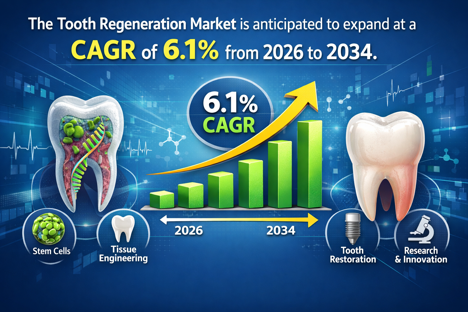 The Tooth Regeneration Market Scope is broad and rapidly evolving, encompassing a range of technologies, including stem cell-based therapies, tissue engineering, and biomaterials designed to stimulate natural tooth regrowth. The Tooth Regeneration Market is anticipated to expand at a CAGR of 6.1% from 2026 to 2034. The market scope extends across various applications such as enamel regeneration, dentin repair, and complete tooth regeneration. Ongoing research initiatives and collaborations between academic institutions and biotechnology companies are expanding the possibilities within this field. Additionally, favorable regulatory frameworks in certain regions and growing investments in dental innovation are contributing to the widening scope of the market. As the demand for biologically driven dental solutions increases, the market is expected to experience significant growth in the coming years.
