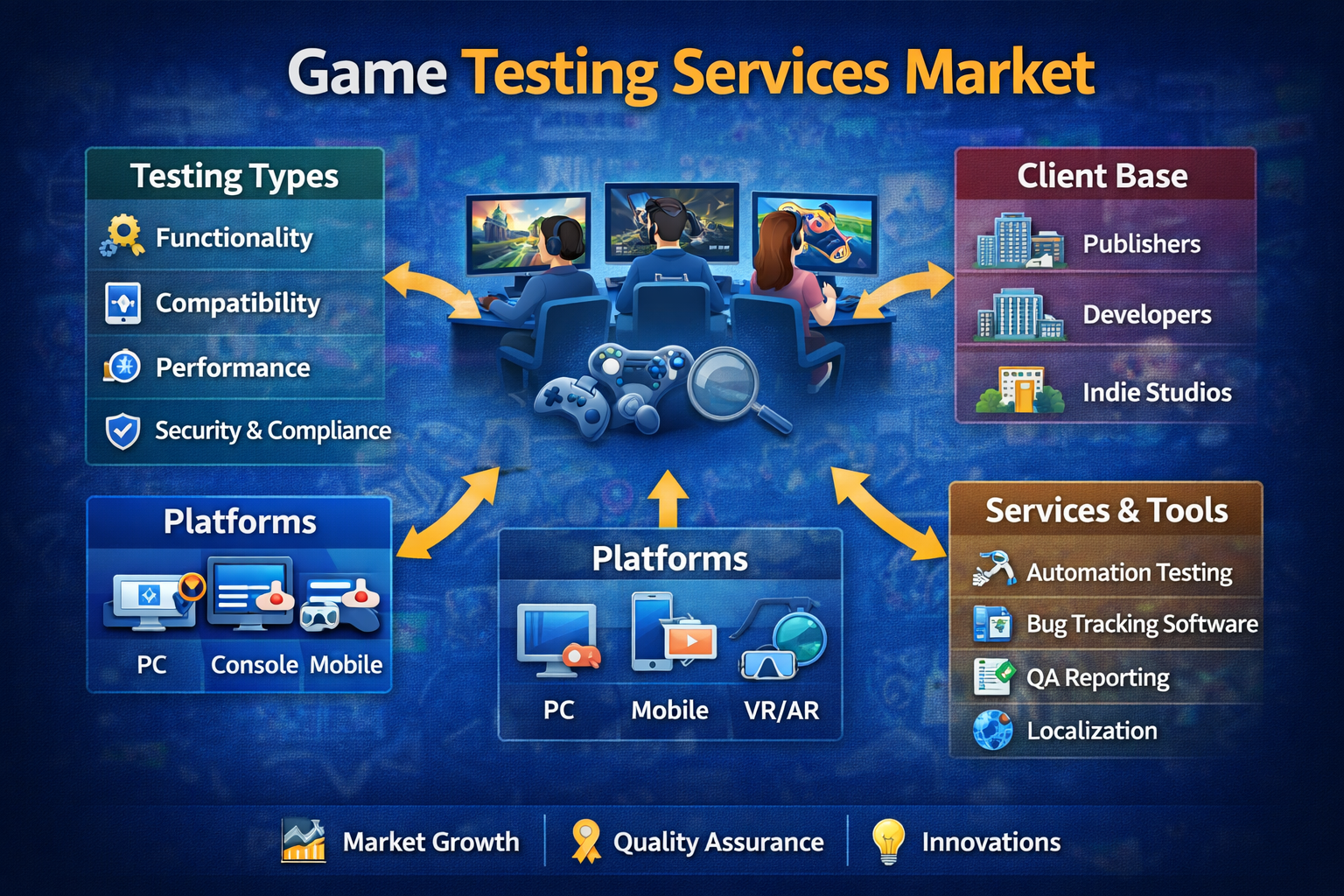 This growth trajectory reflects the increasing importance of rigorous testing services in an era when gamers expect seamless performance across platforms ranging from mobile devices to consoles and PCs. As developers seek to reduce bugs, enhance gameplay, and ensure compatibility across diverse hardware configurations, reliance on professional game testing services is intensifying — creating a fertile landscape for service providers and technology innovators.