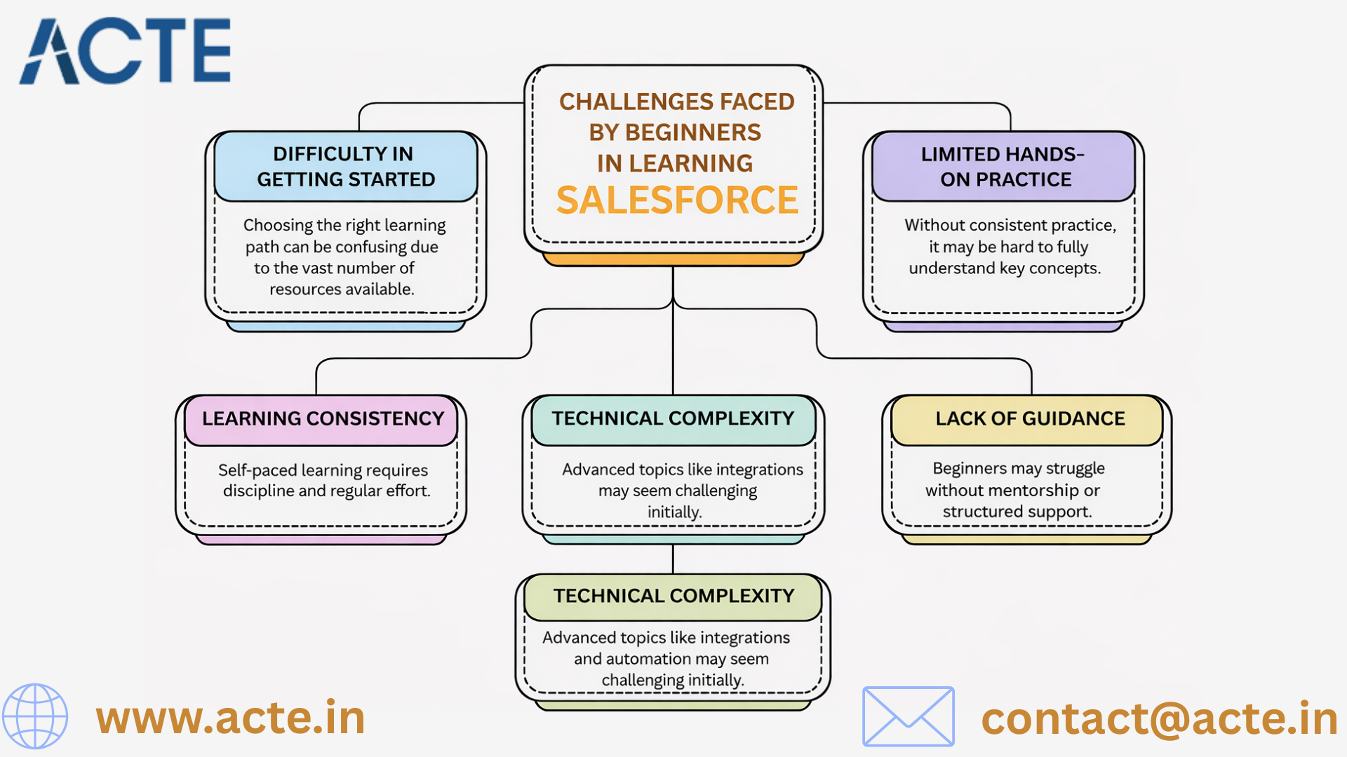 While learning Salesforce from home offers flexibility, beginners may encounter several challenges: