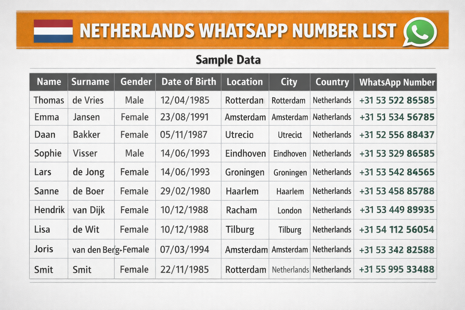 One of the biggest challenges in B2B marketing is data accuracy. Outdated or incorrect contact information can waste time, resources, and opportunities. That’s why our Netherlands WhatsApp Number List is carefully verified and regularly updated to ensure maximum reliability.