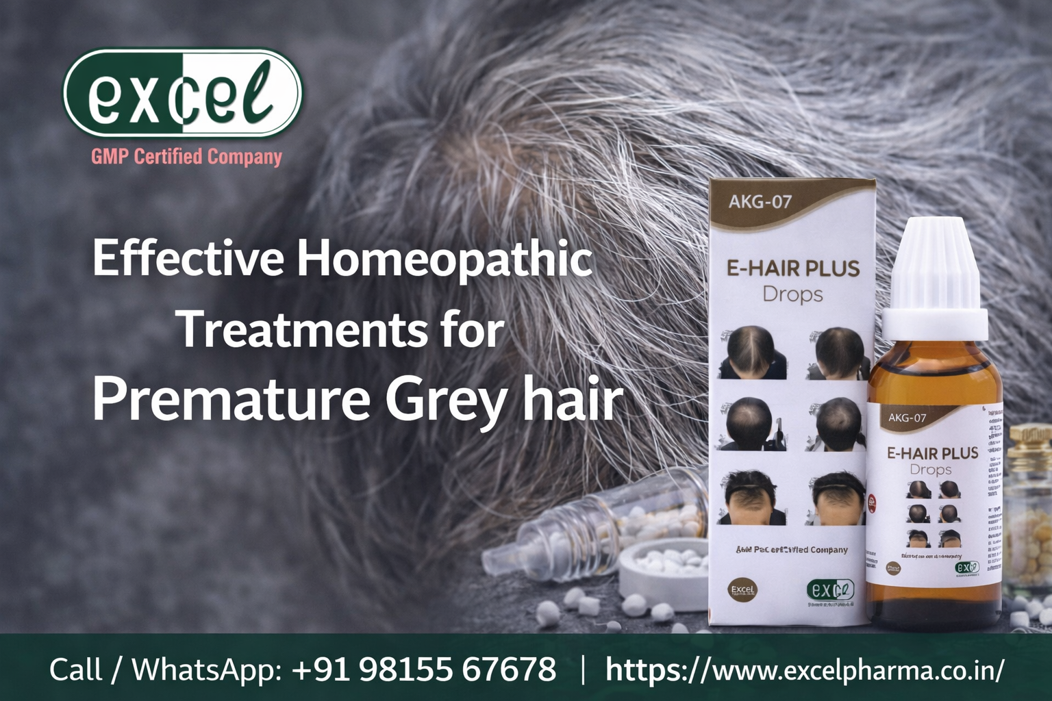 Premature grey hair can affect your confidence, but with the right care, you can manage it effectively. Excel Pharma brings you E-Hair Plus Drops (AKG-07), a trusted homeopathic solution designed to support hair health naturally. It helps reduce early greying, strengthen hair roots, and control hair fall without harsh chemicals. This gentle formula works internally to restore balance and nourish your scalp. This medicine is suitable for long-term use and helps your hair become healthier and shinier over time. Choose a natural way to care for your hair and see the results. Contact us today to start your journey towards stronger, naturally vibrant hair. For more details, call or WhatsApp us at +91 98155 67678.