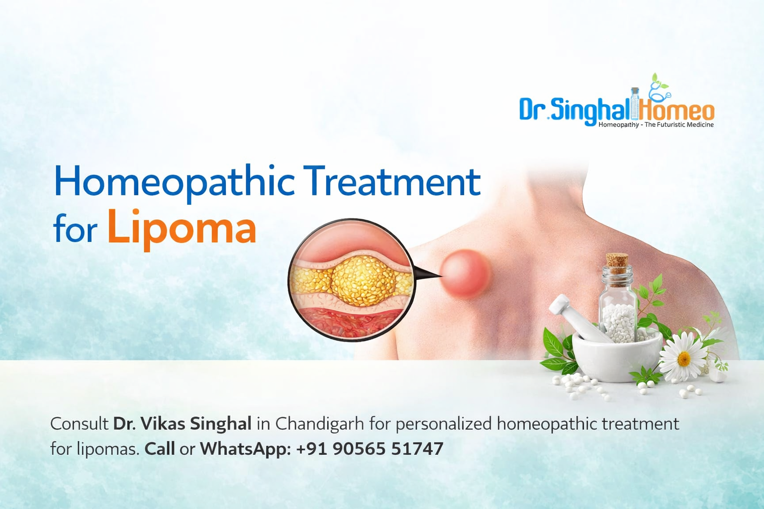 Lipomas are benign fatty lumps that develop under the skin and can cause discomfort and concern for many individuals. While conventional medicine often involves surgical removal, homeopathy provides a gentler, non-invasive alternative. Homeopathic treatments for lipomas can deliver excellent results. For personalized and comprehensive lipoma treatment through homeopathy, consider consulting Dr. Vikas Singhal. For the best outcomes, contact us via call or WhatsApp at +91 9056551747.
